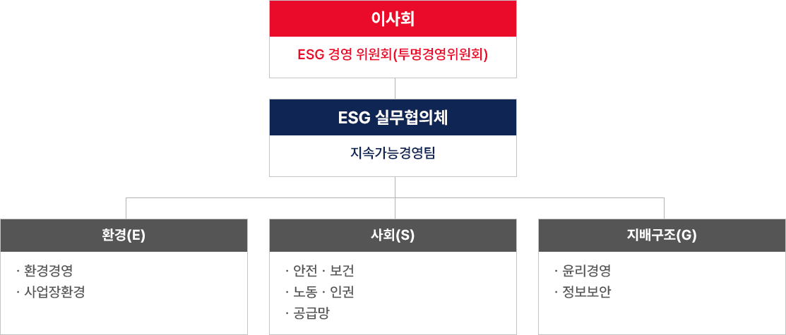 ㈜보원산업은 ESG 경영 이슈와 이해관계자의 의견을 최고 의사 결정기구에 전달하고 주요 안건에 대한 효율적인 의사결정을 위해 지속 가능경영 추진 체계를 운영합니다